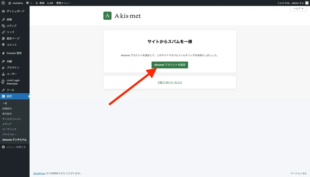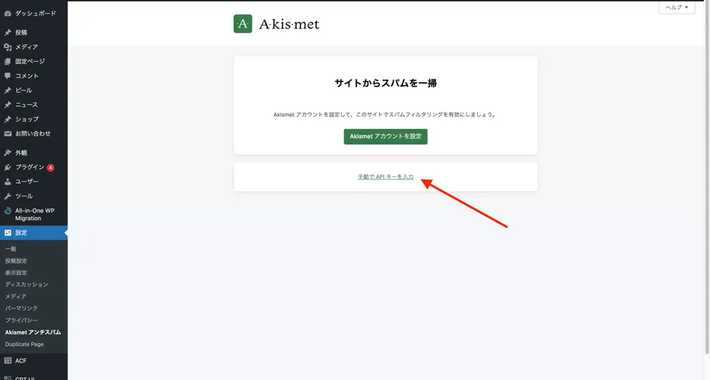 ダッシュボードの設定>Akismet アンチスパムの画面に戻り、「手動でAPIキーを入力」をクリックして入力フォームを表示させます。