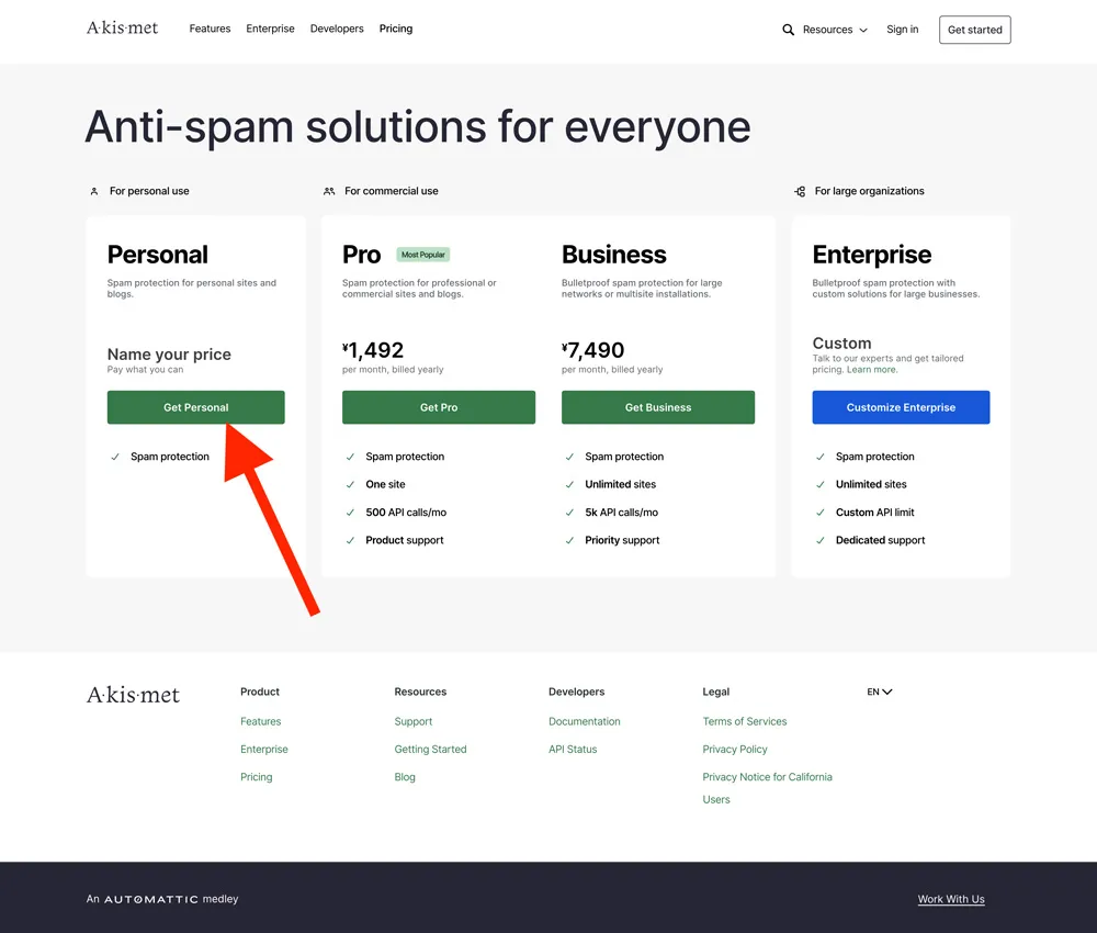 個人で使用するのであれば、Personalで問題ないでしょう。一番左のPersonalのボタンをクリックします。
