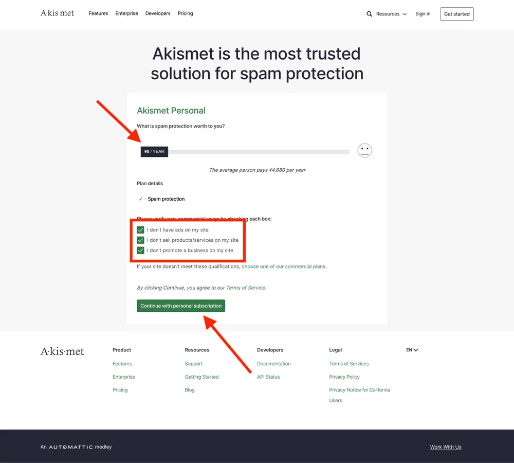 設定>Akismet アンチスパムの画面に遷移したら、緑のボタンからアカウント設定に進みます。