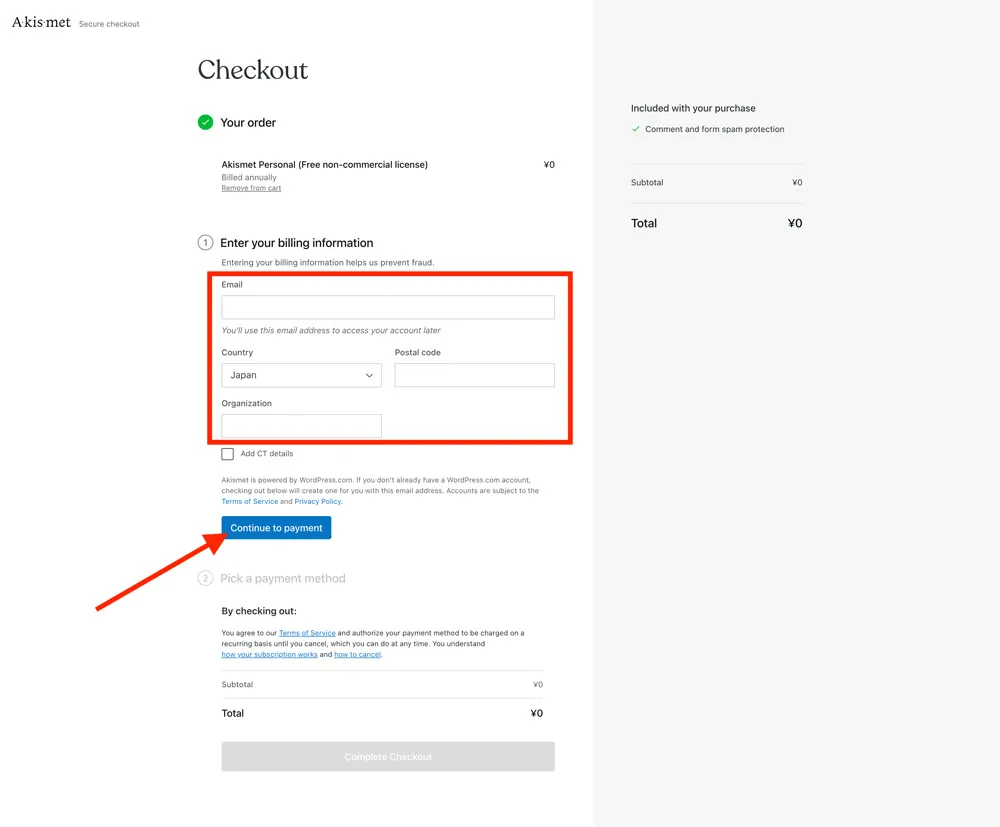 次に、メールアドレスと住所を入力します。住所は国と郵便番号のみ入力すればOK。organisationは空欄で大丈夫です。最後に青いボタンをクリックします。
