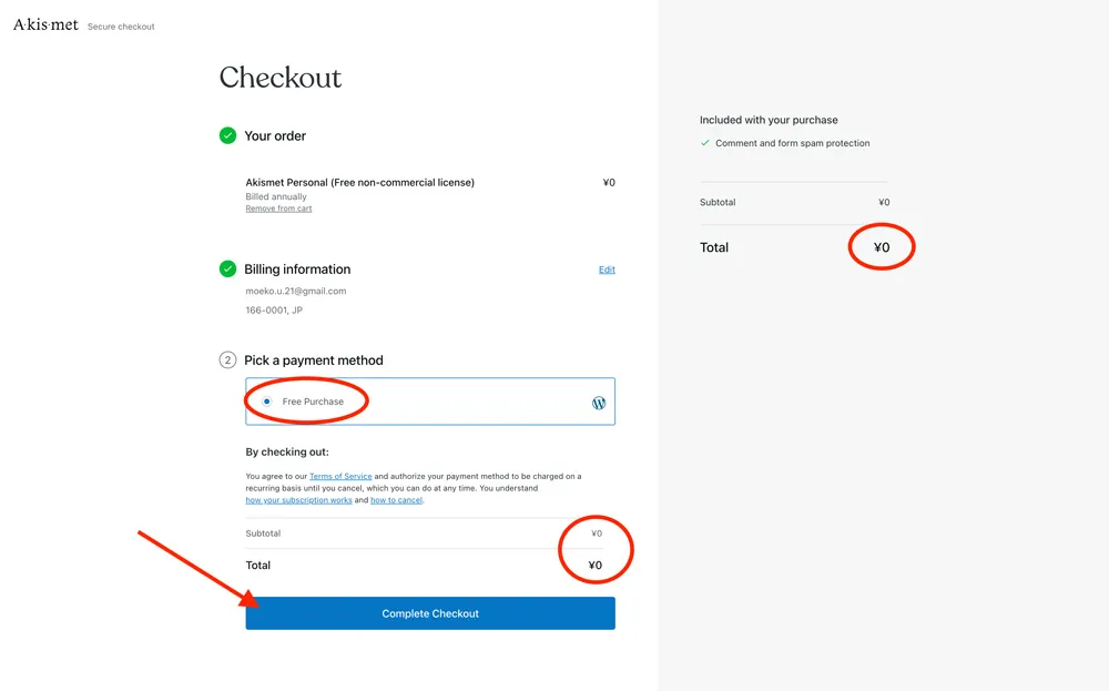 上の2つの項目に緑のチェックマークが付いたら、残る作業はあと少し。画面内の値段の部分が全て「Free」「¥0」となっているのを最終確認して、青いボタンをクリックします。