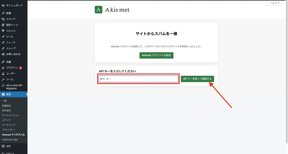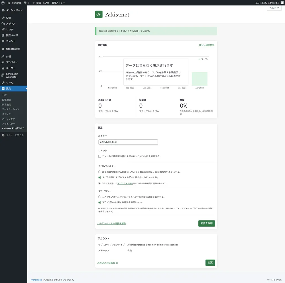 ダッシュボードの設定>Akismet アンチスパムの画面が下図のように変わっていれば、設定完了です。